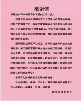 近日,襄陽中環(huán)水務有限公司樊城管網分公司收到一封熱情洋溢的感謝信,信中表達著對樊城管網分公司工作人員主動作為、及時解決用戶用水難題的感謝、贊揚和認可。